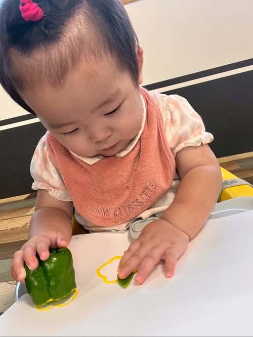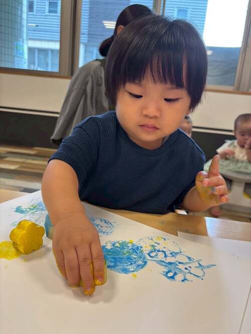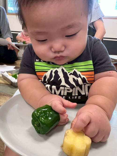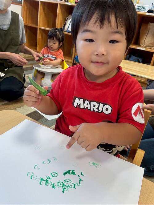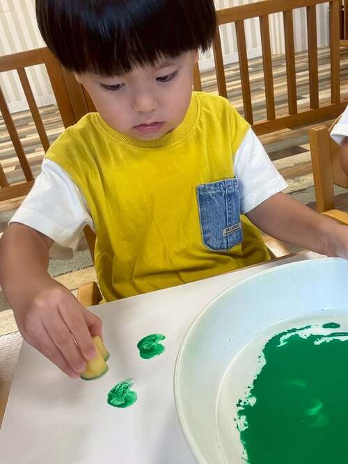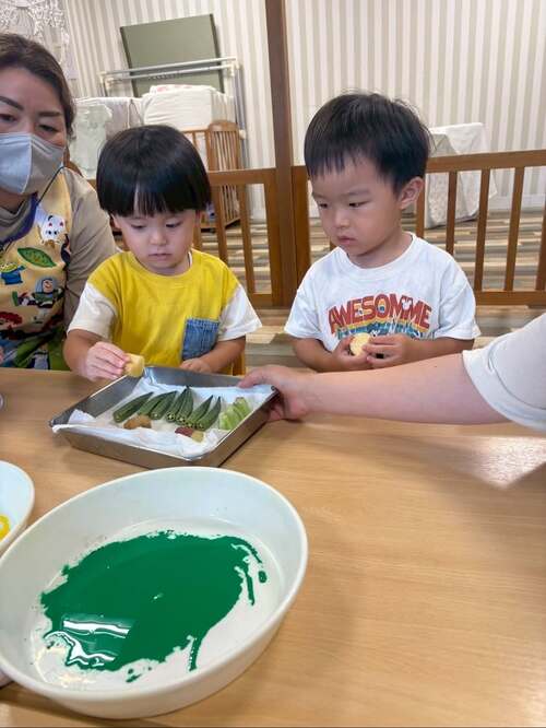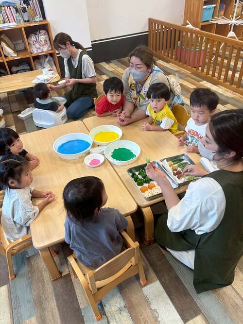 #鹿児島市#谷山中央 #谷山駅近く #企業主導型保育園 #わいずの杜保育園 #0歳児#1歳児#2歳児 #食育 #野菜スタンプ #絵の具遊び #五感で楽しむ